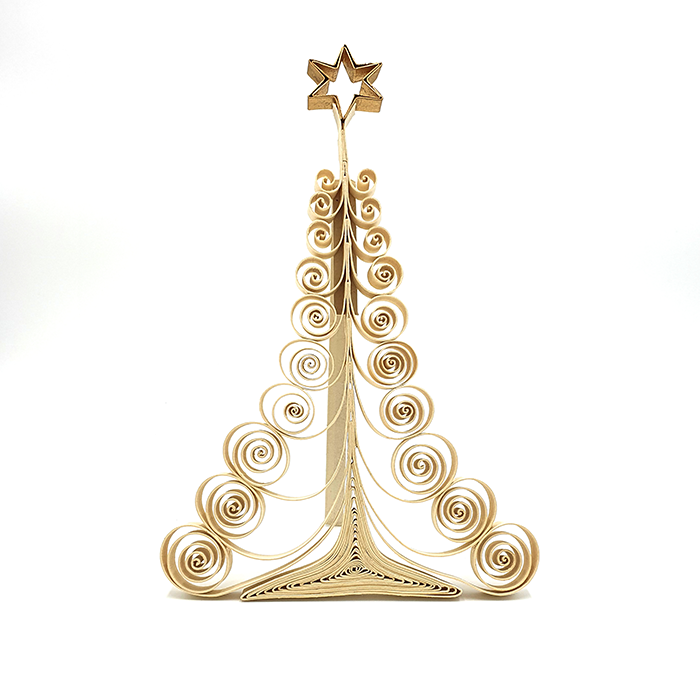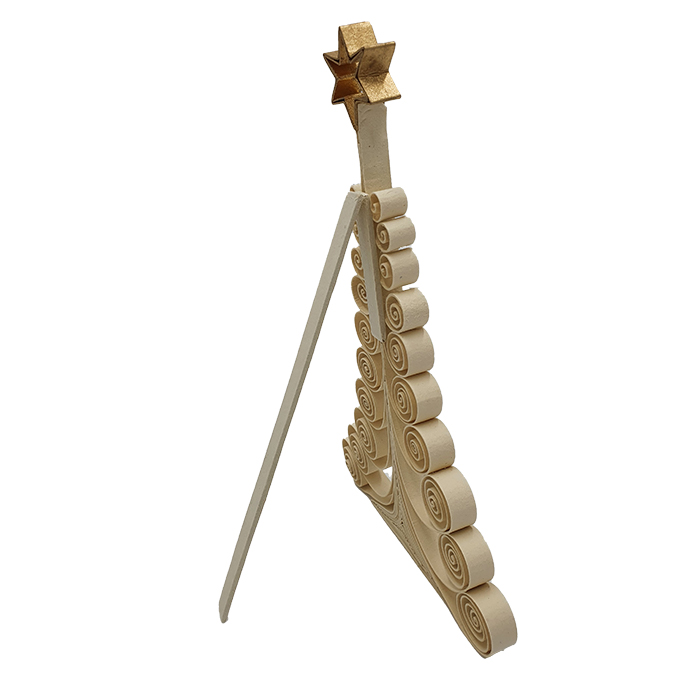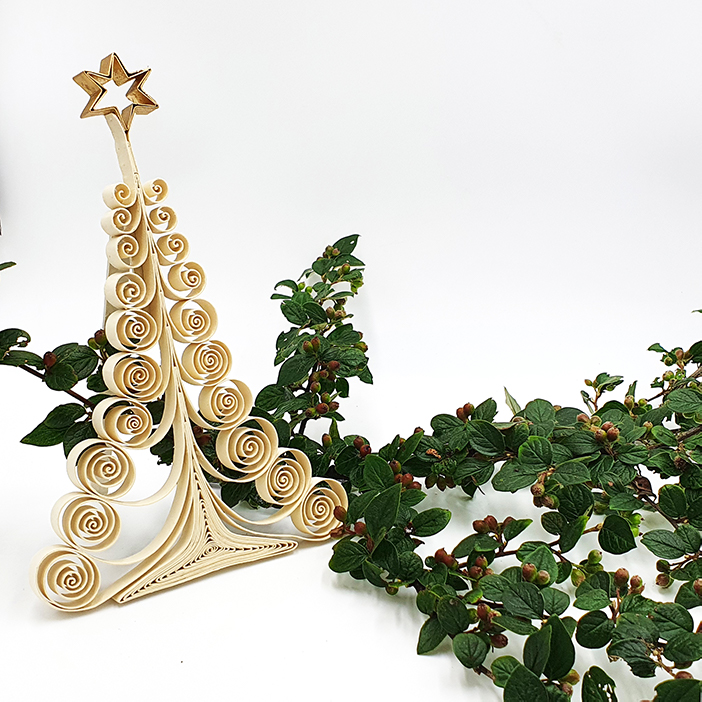 Handmade Curly Standing Xmas tree. This tree is made of jute pulp. Jute rope fibers are cut by hand and recycled to make an exquisite, eco-friendly pulp for paper. Artisans in Bangladesh use the recycled pulp to form the foundation of each jute sheet. Then they cut the paper and make this lovely curly Xmas t